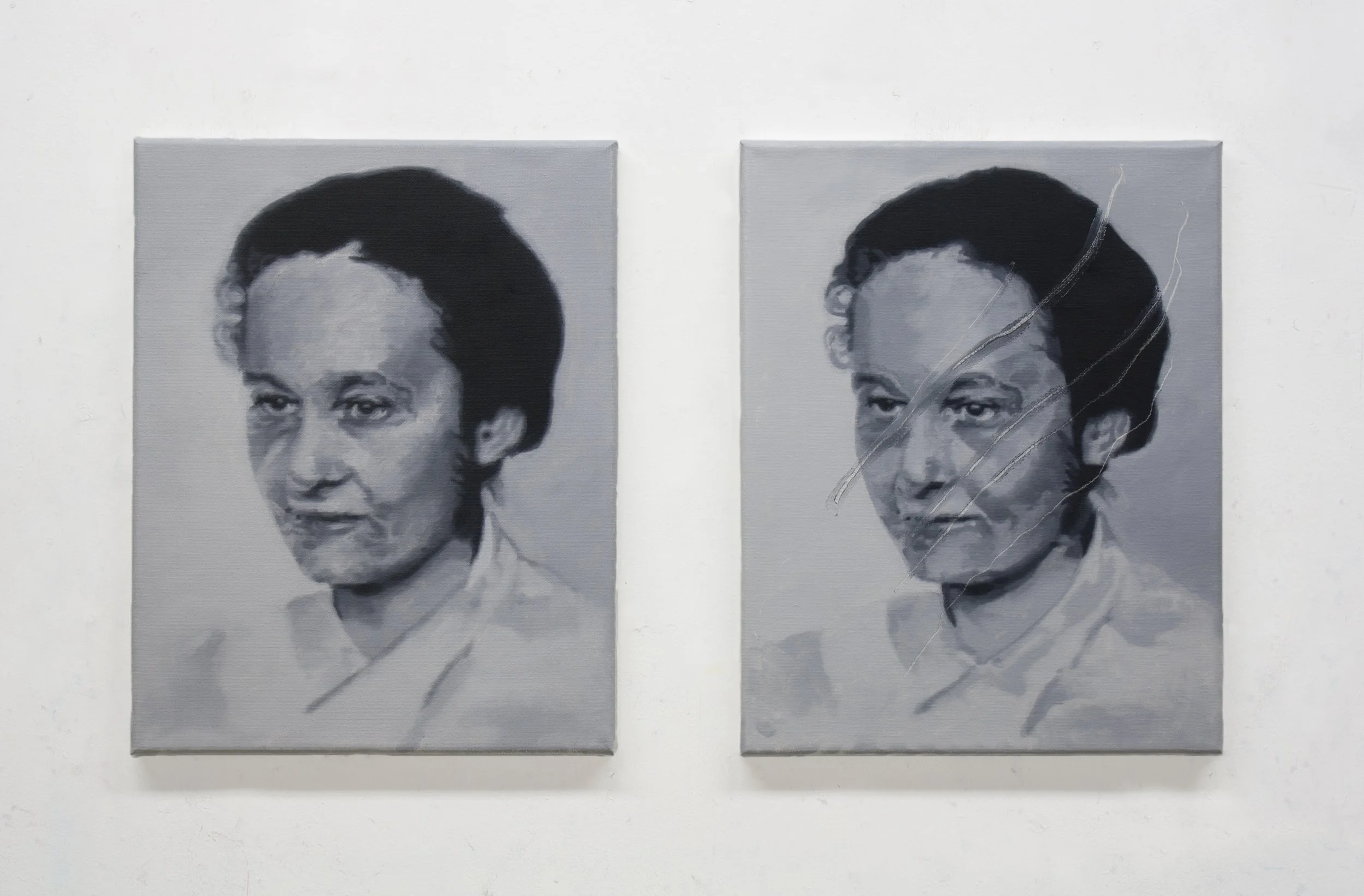 Working from archival photographs, documents, and fragmentary sources, I approach each portrait as both an act of remembrance and an act of inquiry. The images I encounter are often incomplete: damaged prints, blurred reproductions, or photographs stripped of context. Rather than restoring them to a seamless historical image, the paintings retain traces of this instability – marks, erasures, and interruptions that register the fragile transmission of memory through time.